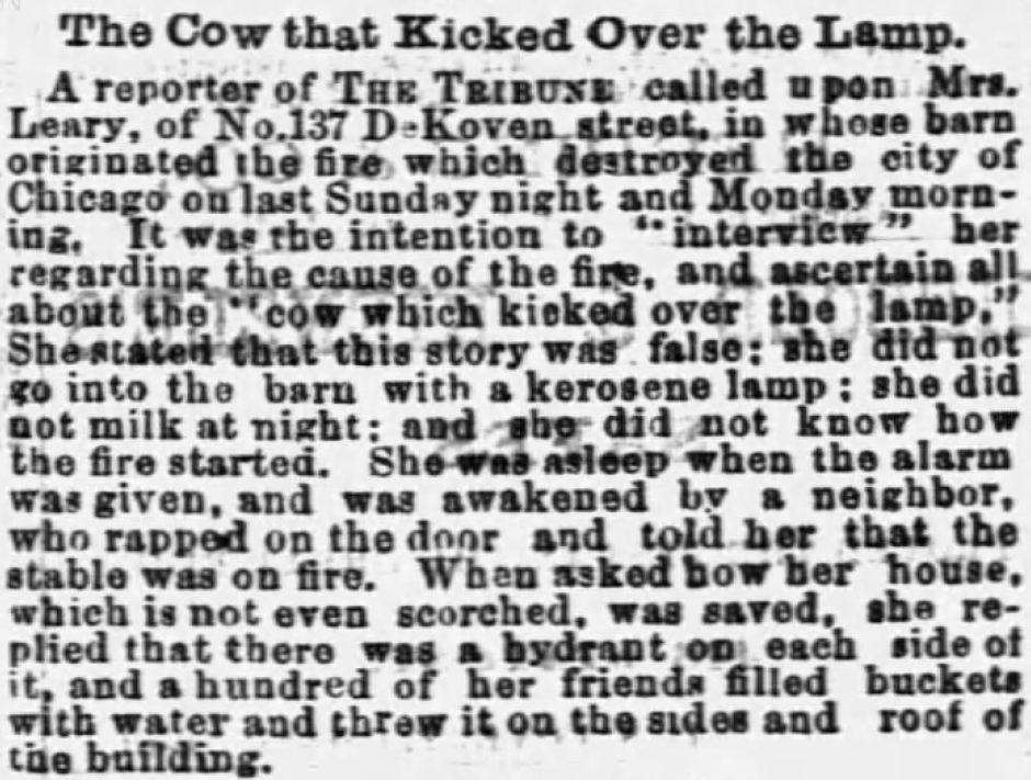 With the fire still burning on the morning of October 9, the Evening Journal put out an “Extra” that said the fire “broke out on the corner of DeKoven and Twelfth streets, at about 9 o’clock on Sunday evening, being caused by a cow kicking over a lamp in a stable in which a woman was milking.”