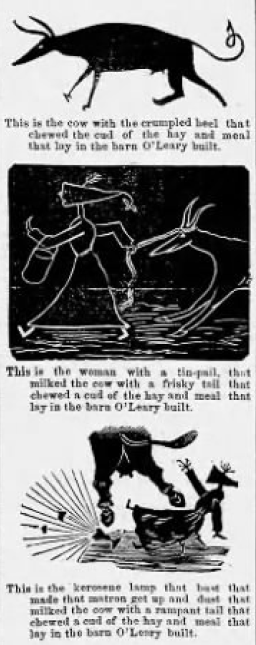 Catherine O’Leary would testify before a city board investigating the fire. She would be depicted in artist’s caricatures as an old crone (despite being about 45 at the time of the fire). Among other indignities, she would be the subject of a twisted version of “This Is the House That Jack Built.” But she would not submit to photos or interviews. And she would not change her story: She and her family were in bed when the fire broke out.